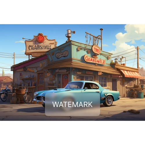 A classic baby blue car parks in front of the rustic Gearsville shops, under the bright desert sun.